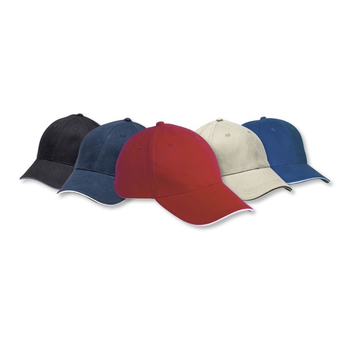 Cap med piping i skyggen, og justérbar strop med messingspænde.