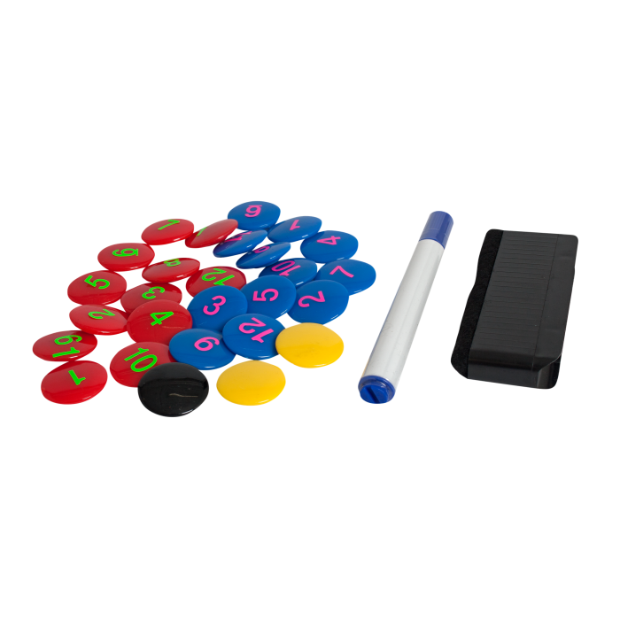 Ekstra sæt til taktiktavler bestående af 27 små magnetiske brikker, pen og afrensningssvamp.
